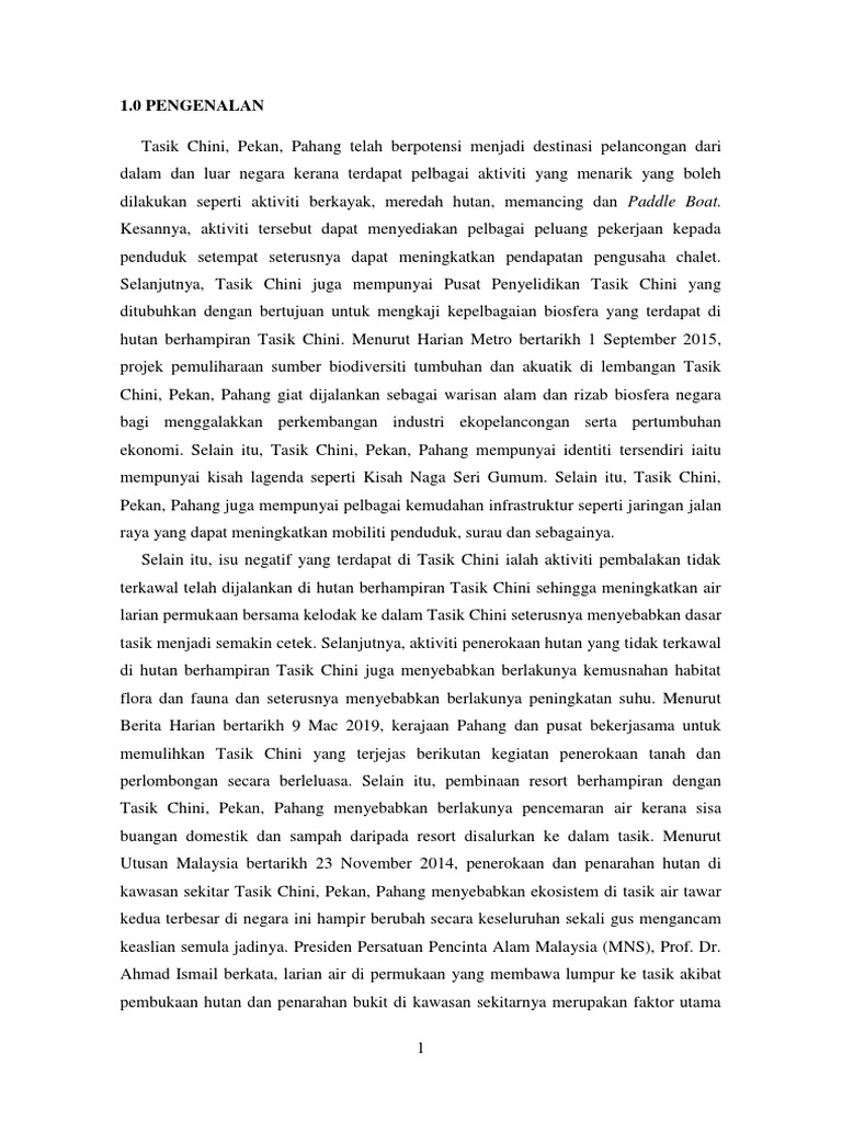 Terlebih dahulu saya mengucapkan terima kasih kepada pihak pentadbir sekolah SMK ROMPIN khasnya Pengetua Puan Hajah Hawiah Binti Chik dan Penolong Kanan Tingkatan Enam Puan Norzawati Binti Aziz kerana memberi sokongan dan kelulusan kepada saya untuk melaksanakan kerja. Tasik Chini Pekan Pahang telah berpotensi menjadi destinasi pelancongan dari dalam dan luar negara kerana terdapat pelbagai aktiviti yang menarik yang boleh dilakukan seperti aktiviti berkayak meredah hutan memancing dan Paddle Boat. Teks Efektif STPM Geografi Penggal 2.
