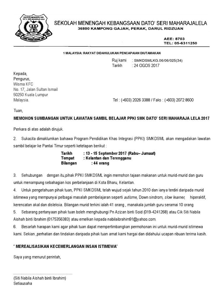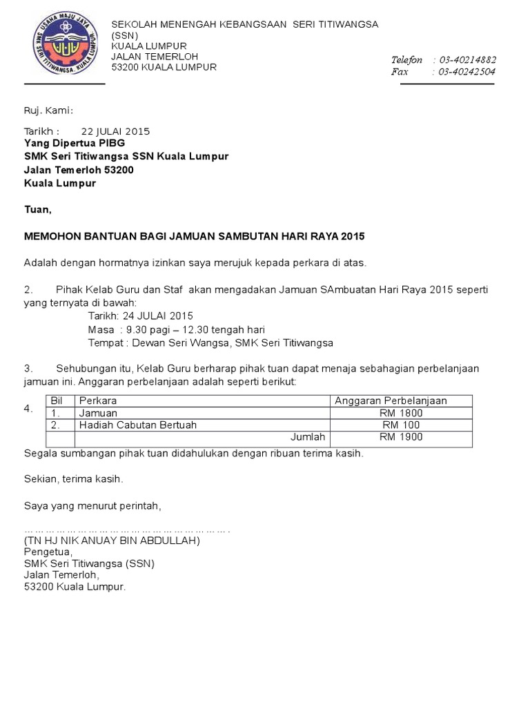Contoh Surat Mohon Sumbangan Lawatan Contoh Surat